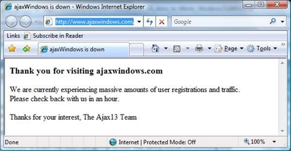 Granted, it's probably not set up in the data center for massive use yet, but when I read today about ajaxWindows and get interested enough to where I wanted to check it out, I was a bit disappointed to see this: