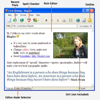 It'll also record audio, check spelling, and insert "what's playing" info. It creates context menu items that allow you to "BlogJet This" and adds a web browser action button.