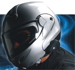 So, today I ordered the Cardco "scala-rider" Bluetooth headset that's made specifically for use in motorcycle helmets. It clamps on (no glue, which is nice) and allows you to answer the phone, as well as (if your phone allows) place calls using your voice. Plus it automatically adjusts its own volume to accommodate for road noise. It's built and designed for use at highway speeds and has some special circuitry to deal with the noise. Plus, tons of standby and talk time, and a good all-around feature set.