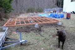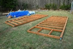 Cory pretty much leveled the site the day before with a shovel, a rake and the 4-wheeler. So today we put together the framed floor. It's in two sections, which were later "wrapped" with a second layer of treated 2x's:
