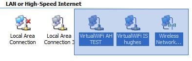 Here's a screen shot snippet from my system after setting up the multiple connections. Shown are two connections created via Virtual WiFi: My infrastructure (IS) network (SSID=hughes), plus an ad-hoc (AH) network connection (SSID=TEST).