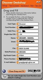I was making an online payment on my Discover Card account today when I noticed they are offering a computer program called Discover Deskshop that not only fills out web forms for you when you are making online purchases, it also has an option to use a unique one-time card number instead of your actual Discover Card account number. That means if you use their application, you never have to send your real card account information to online vendors. Instead you send a pretend card number assigned at the time of purchase by Discover, and that information can only be used for that one purchase.