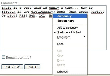 As-you-type spell checking is built right in. Just right-click on anything Firefox doesn't recognize and you'll get just what you'd expect. Looks like it's a basic English dictionary that's used, so you'll have to add some commonly typed terms - even Firefox isn't in the dictionary.