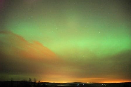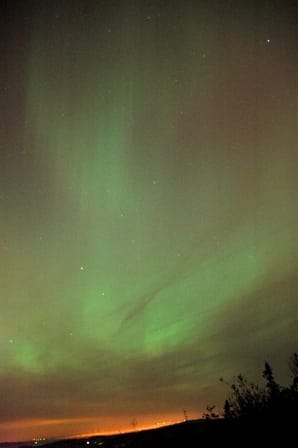 It was so cool to see the Northern Lights for the first time. Like fast waves of light rolling and tumbling from the horizon, up over your head. The light went well past straight overhead from where it started in the north. There were some light clouds near the horizon, but the greenish glow reached far above them. I took these 20-second exposures with my Nikon D70, propped carefully on the hood of my car and rested on my arm, since I didn't have a tripod with me. The location is near my house in Deer Island, Oregon.