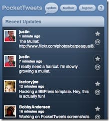 I found a few options, including a really nice web-based client specifically made for the iPhone (or the iPod Touch) called PocketTweets, which is clean in appearance and includes pretty much all the Twitter functionality. I can post my own Twitter updates (called "Tweets"), send replies to others, or anything else on Twitter I might want. It's certainly better than any of the other clients I found. Very cool.