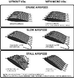NASA researchers developed micro VGs to control this flow delamination by producing miniature, controlled spirals of air, called "vortices." The spirals of air laminate well to the surface of the wing and as a result airflow over the wing is more efficient and “sticks” better across the entire surface, including at lower air speeds and higher angles of attack. The result is reduced drag and increased wing efficiency and lift (or you can think of it in terms of