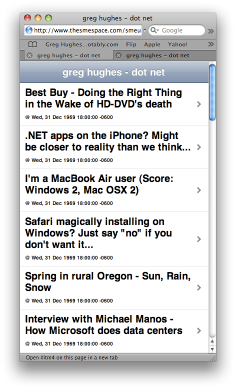 I discovered (via iPhone Atlas) a new web app that lets you specify any well-formed RSS feed, which it converts to an iPhone-formatted and friendly list of headlines - sliding animations and all. My site's feed can be seen by clicking here.