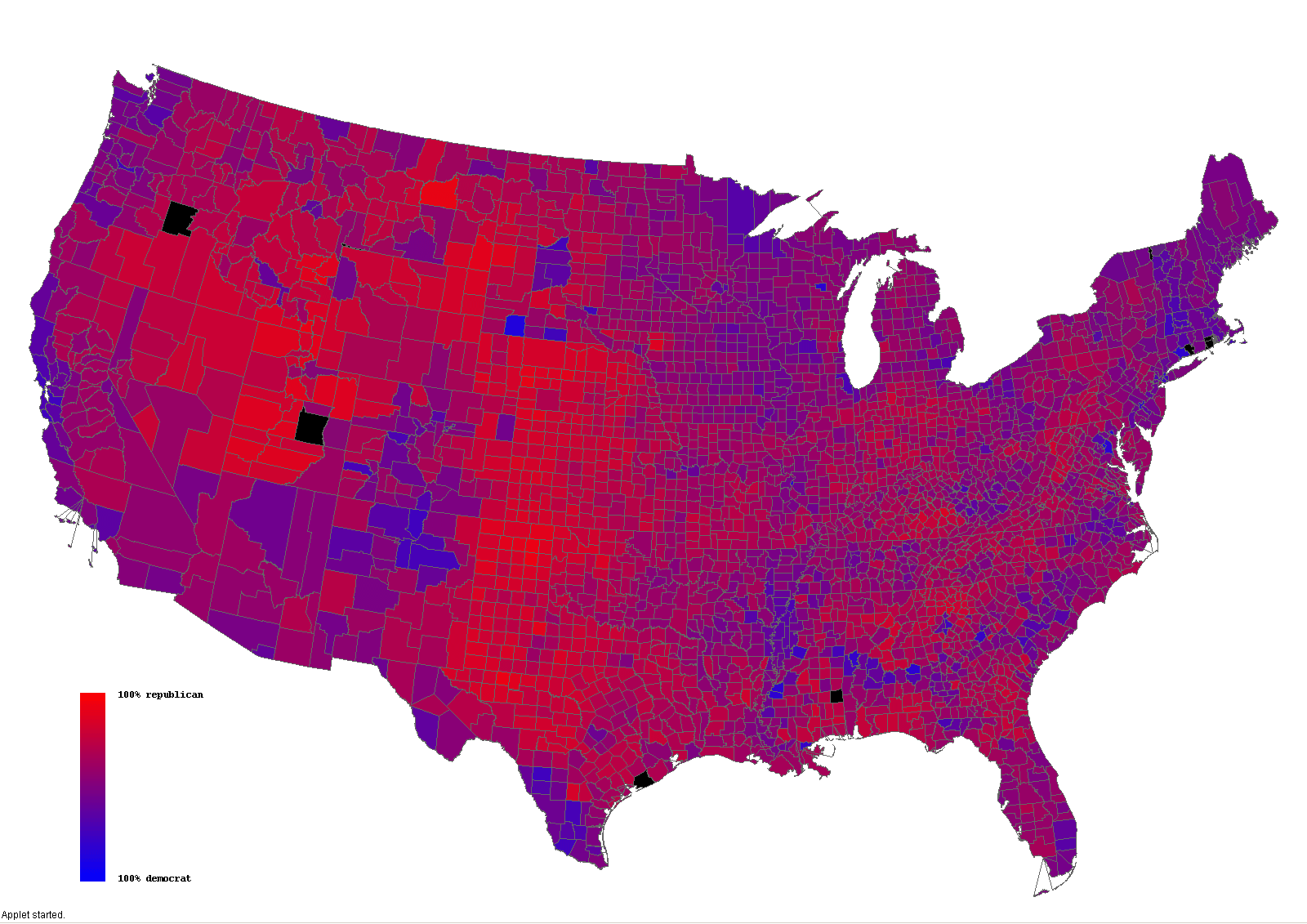 Well here we go - lots of additional maps from Michael Gastner, Cosma Shalizi, and Mark Newman at the University of Michigan, purple variation maps from Robert Vanderbrei, and a cool 3D map from GIS/CBS News. Here's an animation of the 2004 vs. 2000 vote distribution - click it to get to the full-size image.
