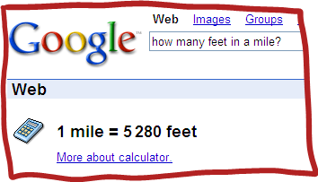 Google's popular "Calculator" functionality has long been touted as useful, and it looks like MSN has similar capabilities. One subtle difference, though, is that Google Calculator returns a page with just the calculator results followed by a link to perform the web search, where MSN returns the answer plus the web search results lower on the same page: