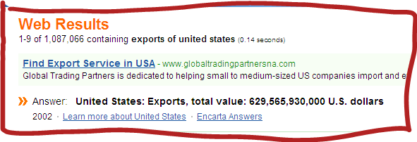 Population, well that's cool. What about other facts? I searched for "Exports of the United States" and got this: