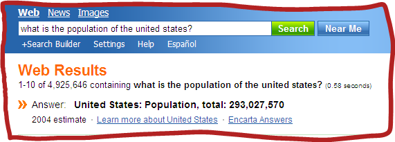 For example, I tried searching for the term "What is the population of the United States?" Google provided some useful and well-chosen links to web sites (Census Bureau, etc.), but MSN Search came up with something even better - the actual answer to my question (click the image to perform the search yourself):