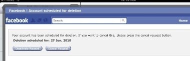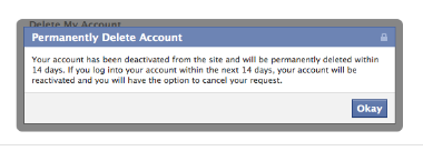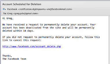 and received the notification both on-screen and in email that my account was scheduled for deletion in 14 days (which, by the way, is a very good way to go about this on Facebook's part, but we can save that for another time).