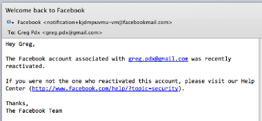 What's even more interesting is the fact that when I tried to recreate the situation again, Facebook is functioning as advertised. I'm now being prompted and asked if I want to cancel deletion or deactivate the account, where before I got the unexpected welcome-back email.