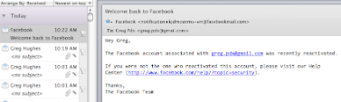 But wait -- I then went back to by notebook once again and opened up my web browser, and tried to log back into Facebook. I expected to see the same screen shown directly above, but instead was surprise to see my Facebook profile page! Within seconds, an email arrived from Facebook, again welcoming me back to Facebook. The only problem is, I never clicked on the Cancel Request button to tell Facebook I wanted to cancel the deletion of my account.